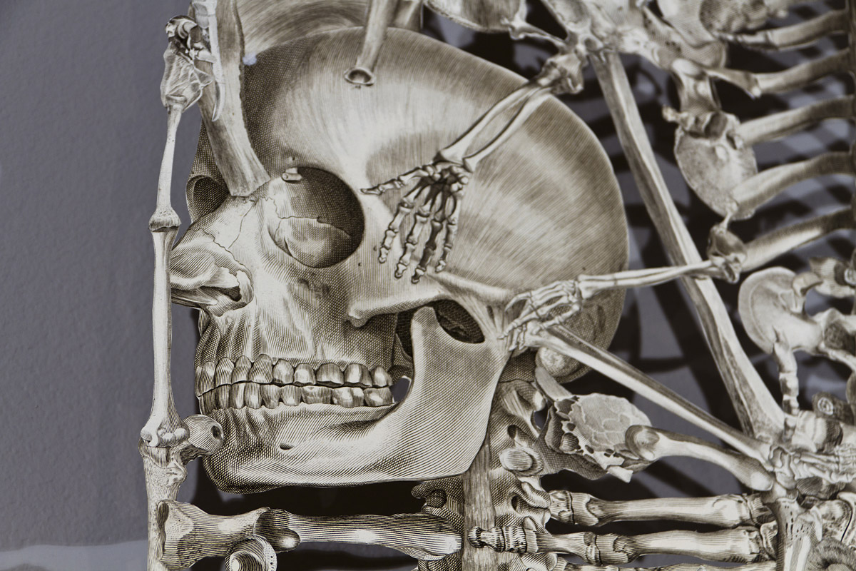 Inspired by the Capuchin bone memorial, Balint Zsako’s “Monument” is an approximately nine-foot tall collage of skeletons in his exhibition at the Loyola University Museum of Art.